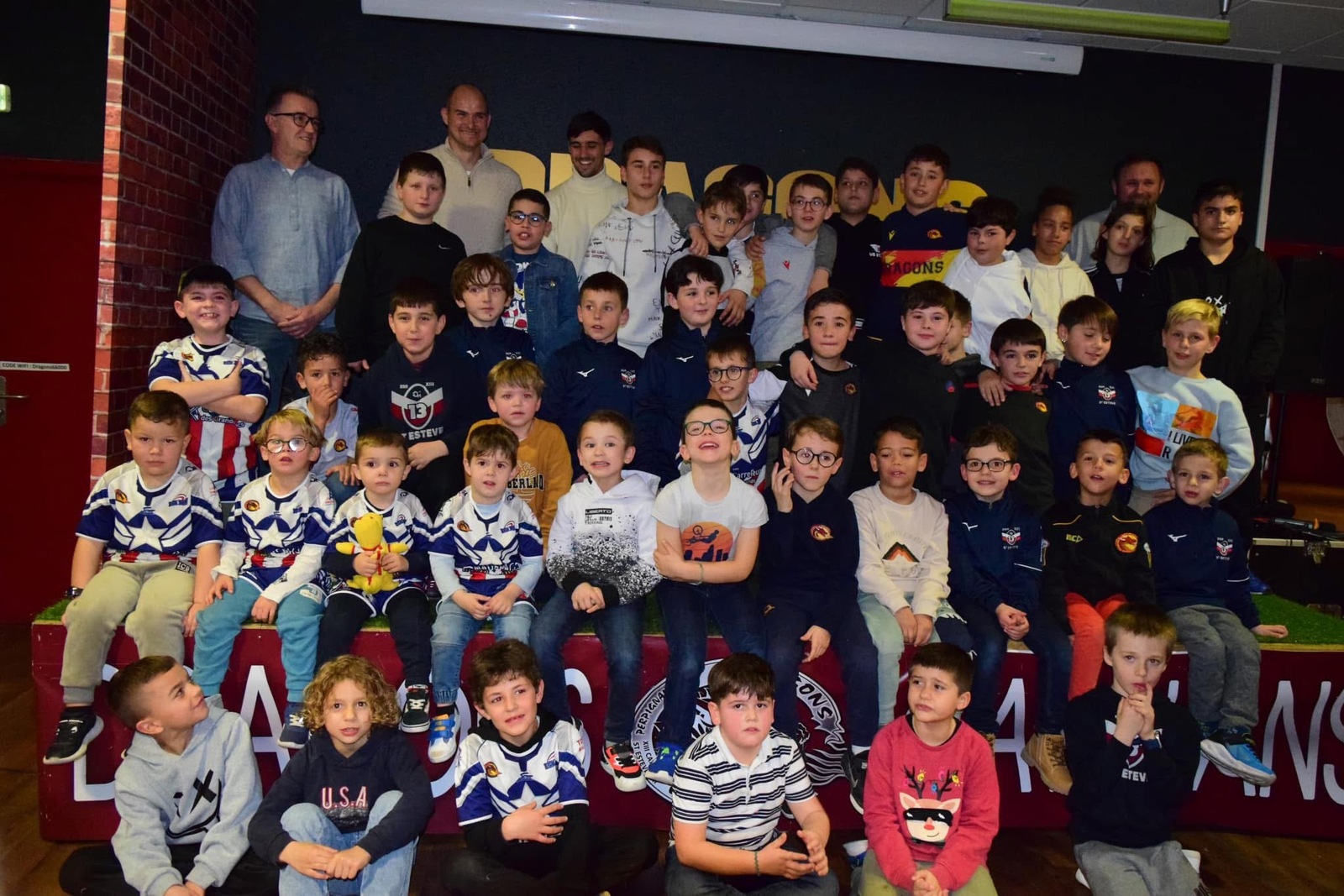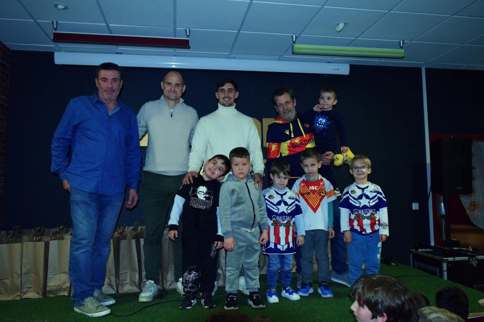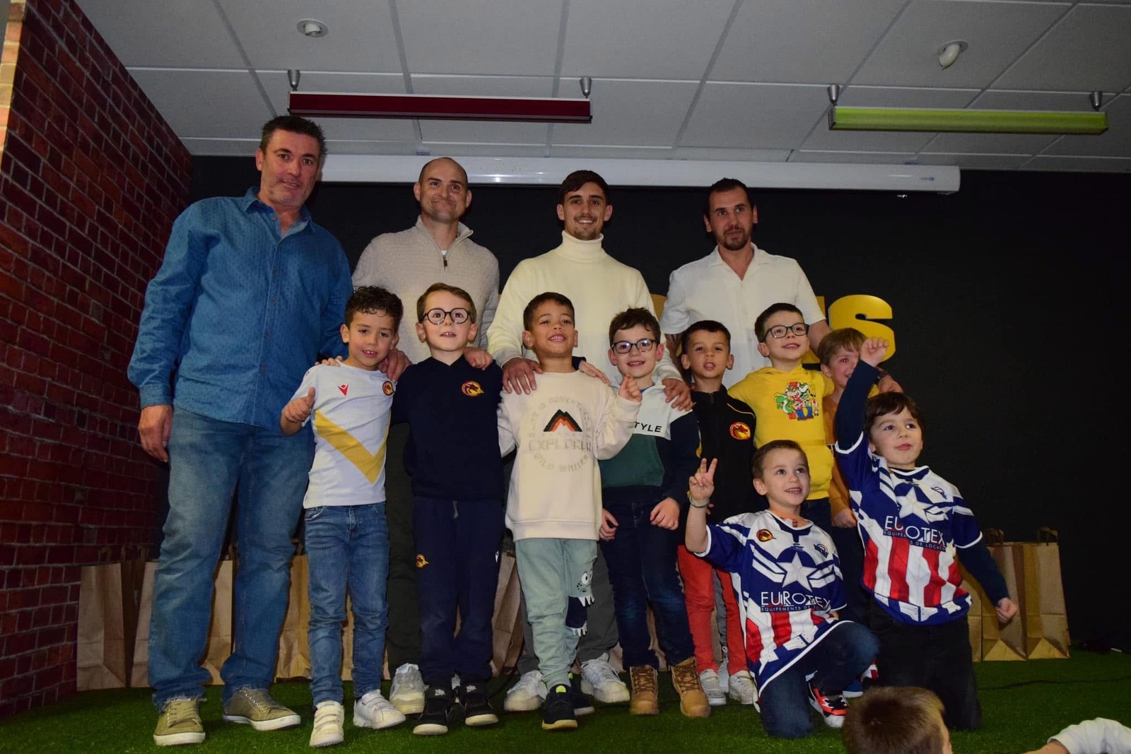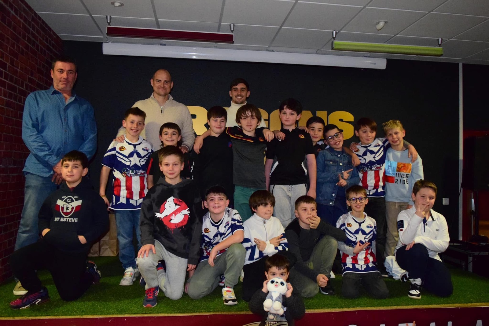 Les enfants ont vécu un moment inoubliable grâce à la présence de notre parrain de club Arthur Mourgue, joueur des Dragons Catalans, qui leur a remis avec enthousiasme les joggings officiels du club.