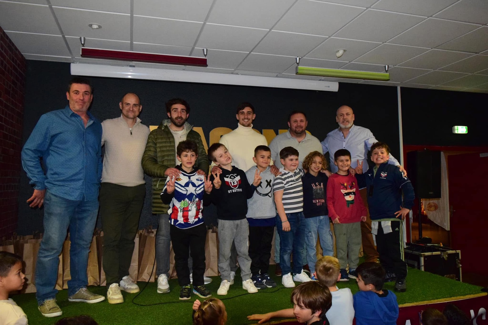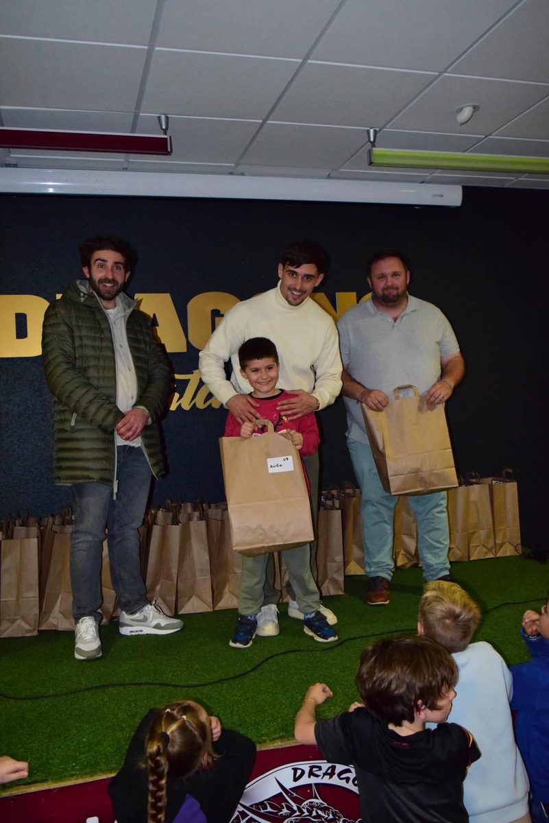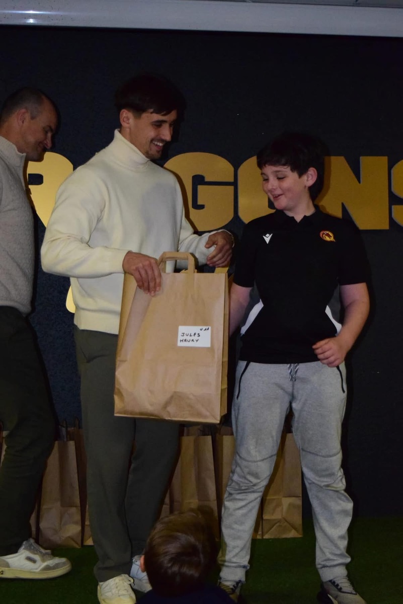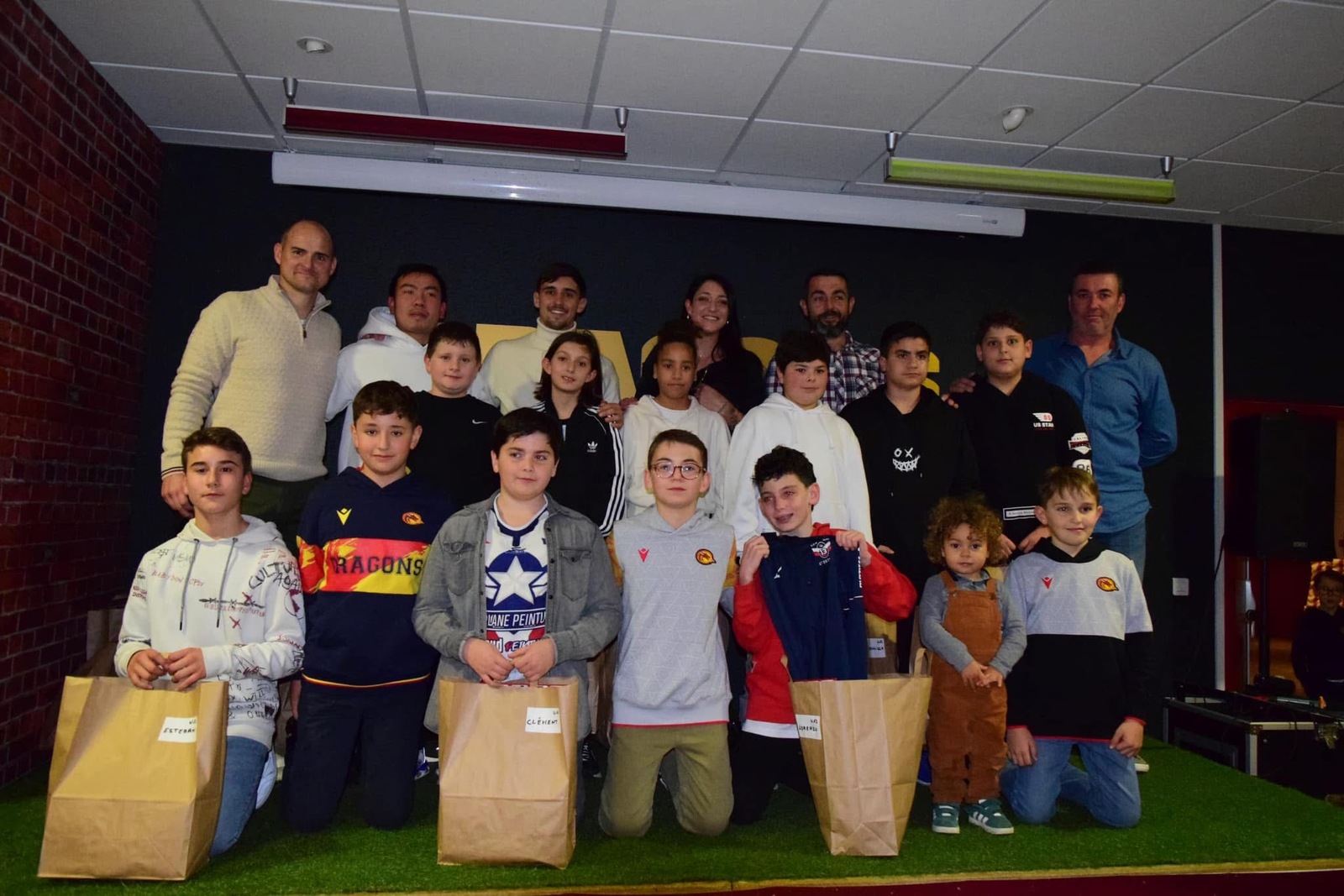 Les enfants ont vécu un moment inoubliable grâce à la présence de notre parrain de club Arthur Mourgue, joueur des Dragons Catalans, qui leur a remis avec enthousiasme les joggings officiels du club.