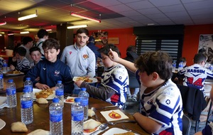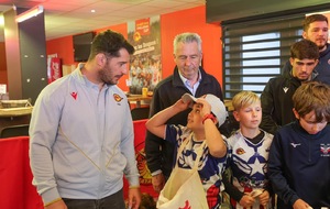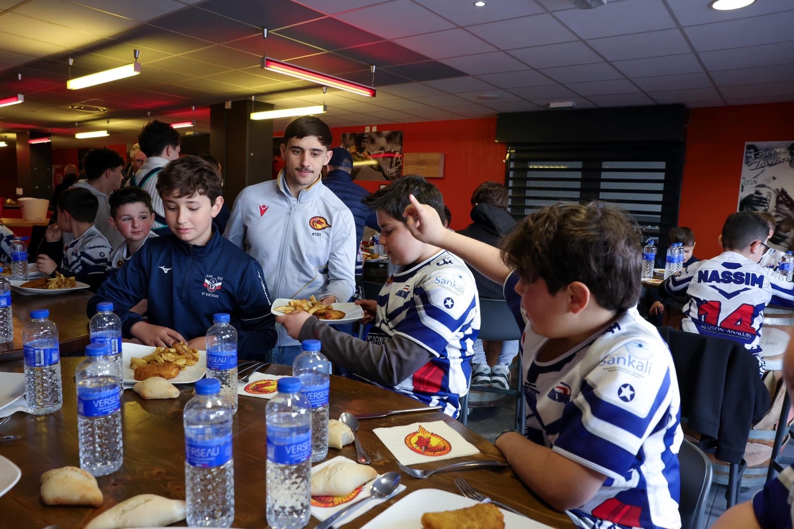 Après la visite des infrastructures nos licenciés ont pu partager un moment privilégié lors du repas de midi autour de Benjamin Garcia (capitaine des Dragons Catalans), Arthur Mourgue (parrain du club), Romain Navarrette, Mathieu Laguerre.