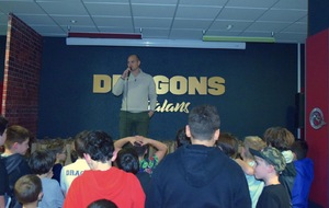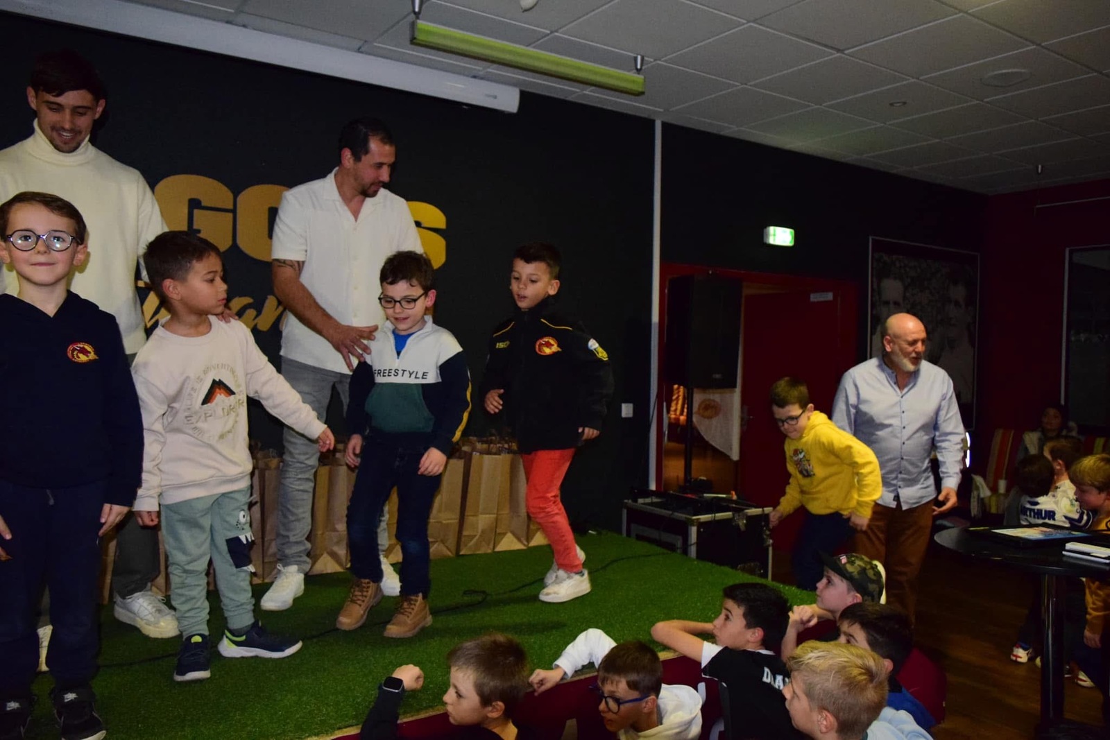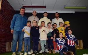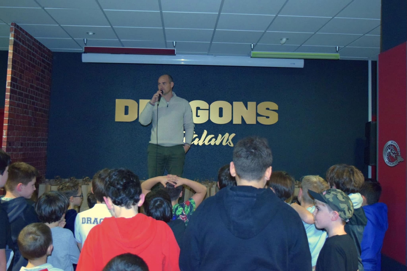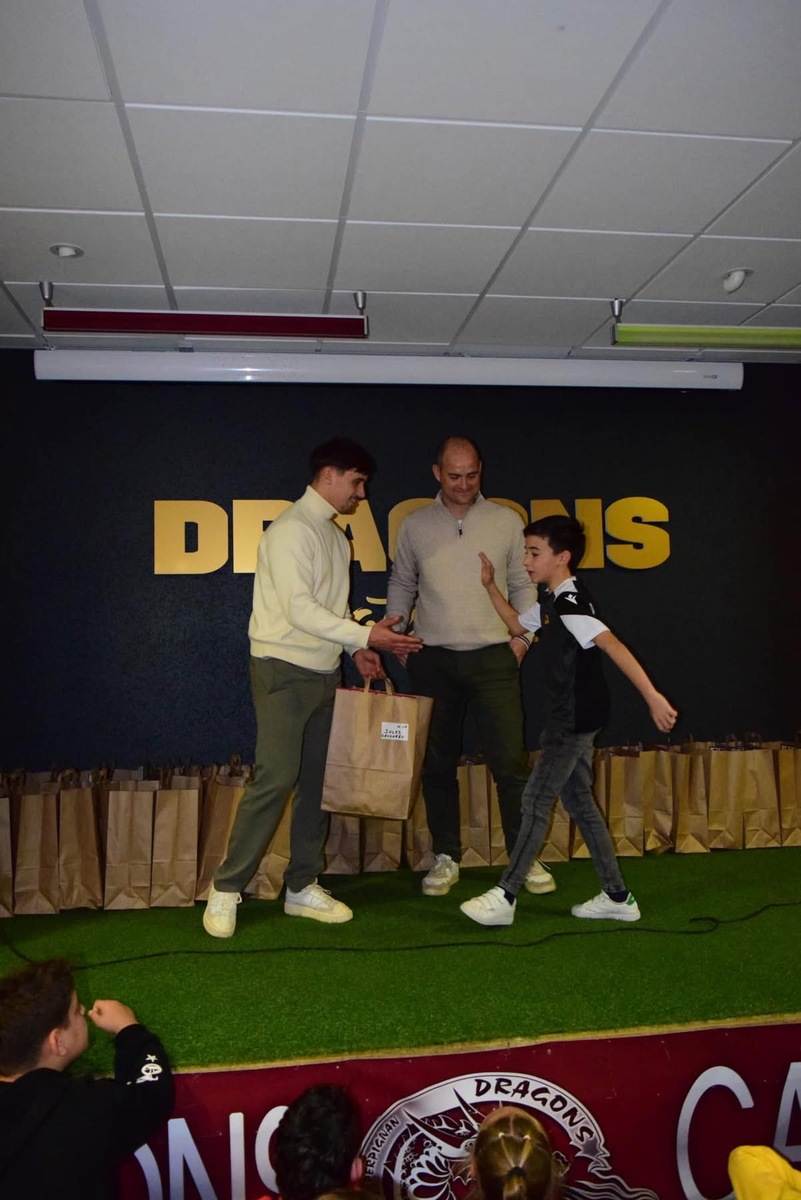 Les enfants ont vécu un moment inoubliable grâce à la présence de notre parrain de club Arthur Mourgue, joueur des Dragons Catalans, qui leur a remis avec enthousiasme les joggings officiels du club.