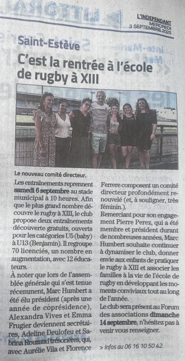 Lien de l'indépendant : https://www.lindependant.fr/2025/09/02/cest-la-rentree-a-lecole-de-rugby-a-xiii-de-saint-esteve-12907130.php